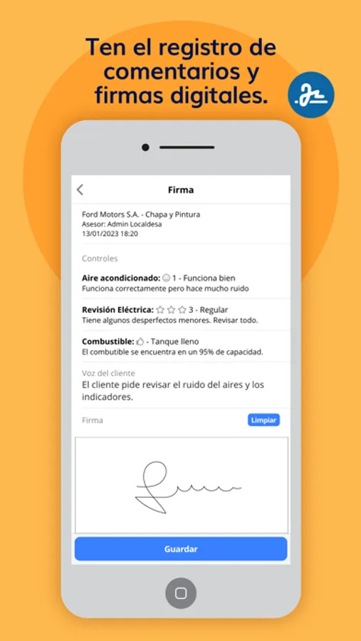 La App está totalmente adaptada para que el Asesor de servicio pueda volcar toda la información que sea necesaria desde que el veh’culo ingresa o egresa; como check list adaptadas a cada taller, imágenes, registrar comentarios, configurar notificaciones en los distintos estados del vehículo, tomar la firma del cliente para registrarla de forma electrónica.