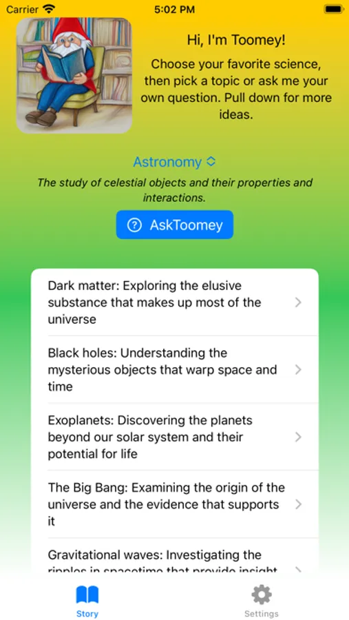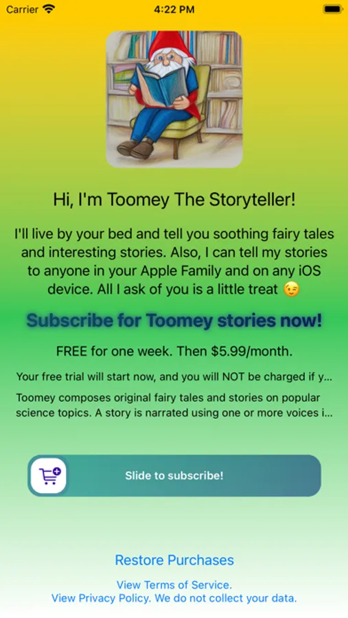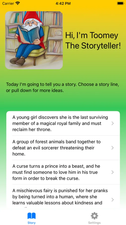 Toomey uses sophisticated AI algorithms to generate captivating fairy tales and popular science stories that are both entertaining and educational and sure to delight audiences of all ages. Whether you're a fan of classic fairy tales or interested in learning more about popular science topics, our app has something for everyone. One of the unique features of Toomey is that it uses AI to not only compose the stories but also to narrate them to the listener in multiple languages and multiple voices. The user-friendly interface allows you to easily select the theme of story, the language, and the narrator voice. Toomey is an excellent tool for those who want to indulge in the creativity of storytelling while learning something new. The stories are available on a paid subscription basis with a free trial period. Internet access is required for story generation.