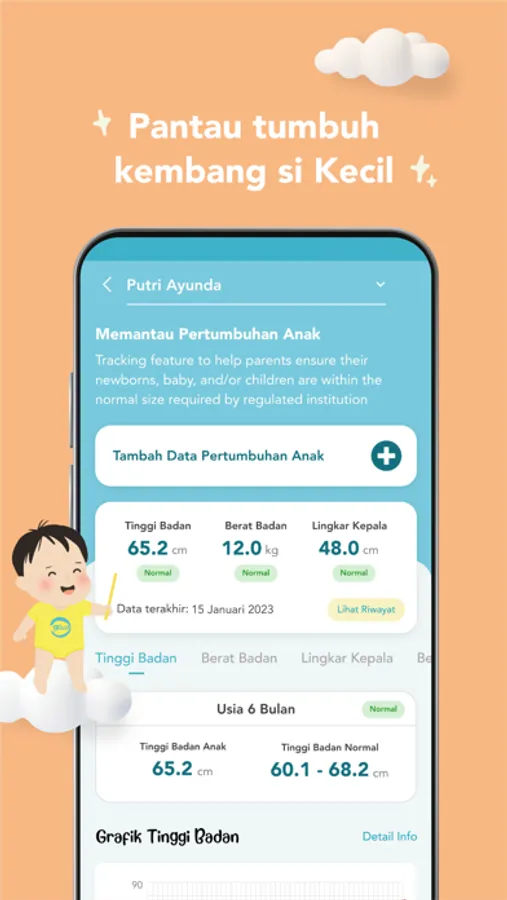 • Simpan dan lihat riwayat seperti Tinggi Badan, Berat Badan, dan Lingkar Kepala dari waktu ke waktu.