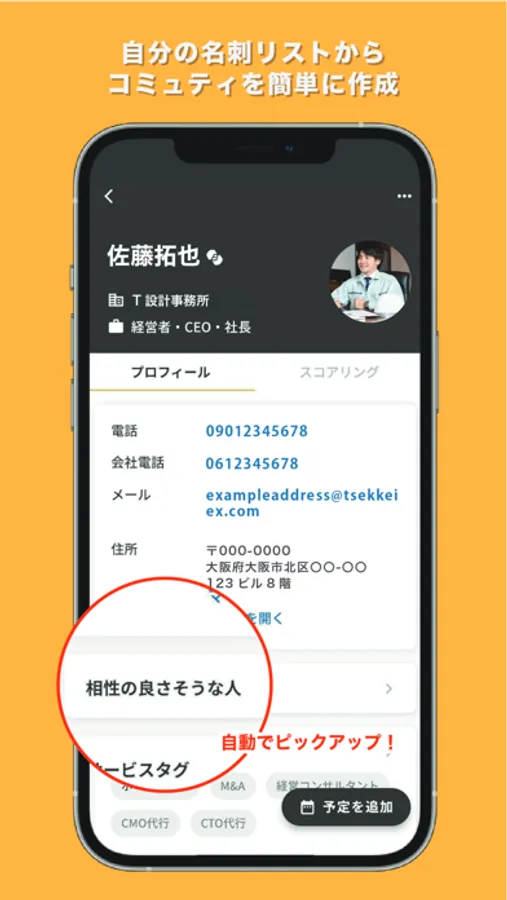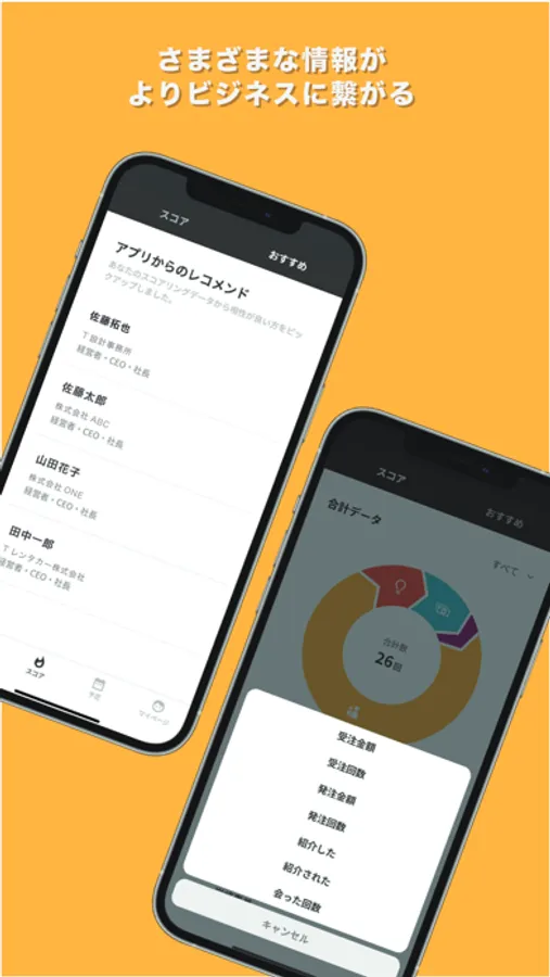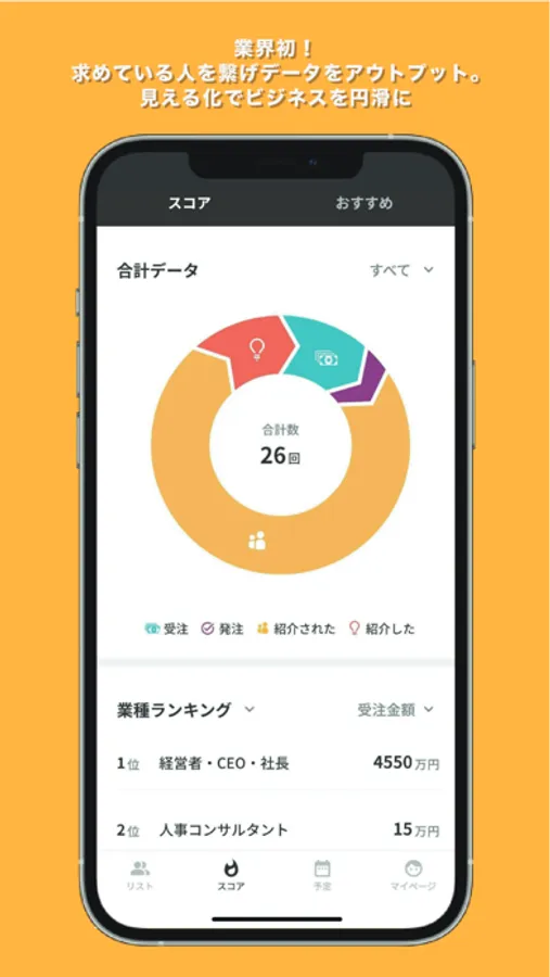 アプリ内では、会った回数や紹介された回数、売り上げ向上につながった紹介や発注の金額・回数をもとに、戦略的な人脈構築が可能です。さらに、ランキング機能を使って職業や個人間の相性を評価することもできます。