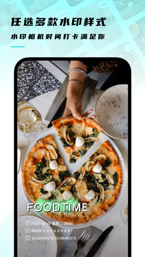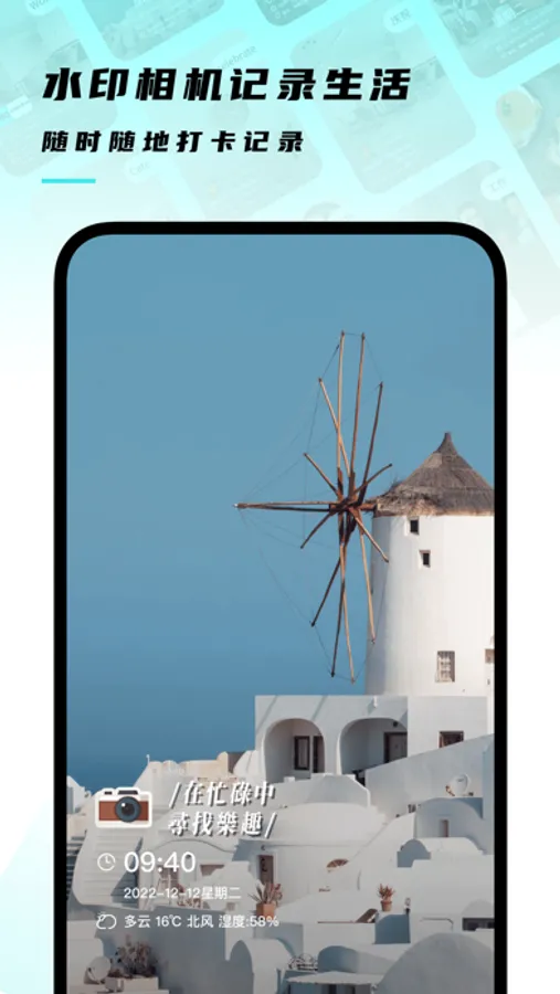 工作生活多款水印样式任你选择,包括时间地点固定打卡,一键获取当前时间地点作为水印,你的水印你说了算~