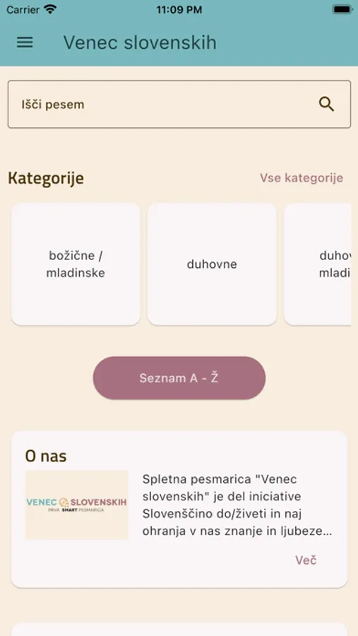 Najdi slovenske pesmi po naslovu ali njihovem besedilu! Razporeditev pesmi v razne vsebinske kategorije dodatno olajša iskanje posameznih pesmi.