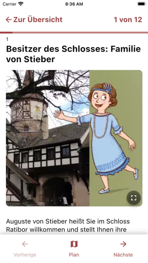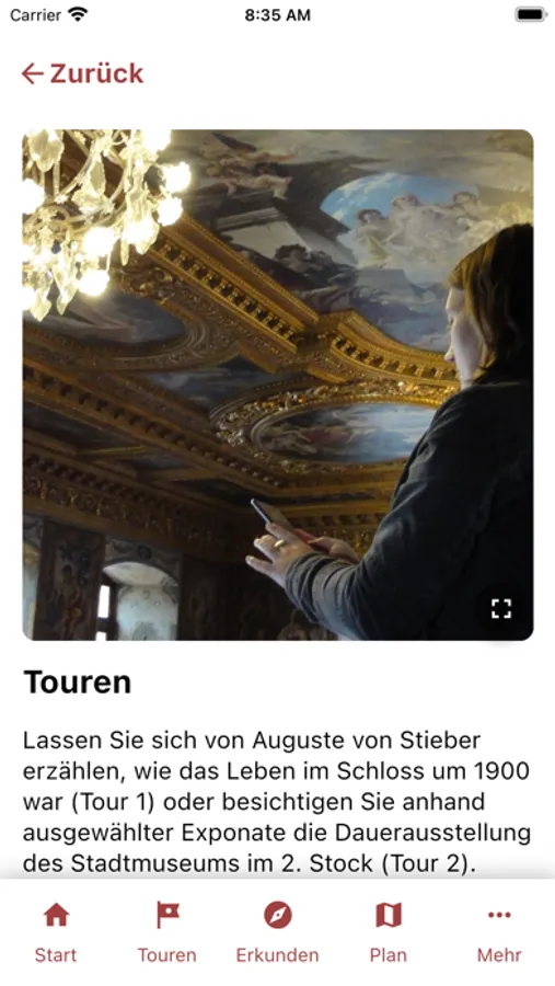 Diese App begleitet Sie bei Ihrem Besuch. Lassen Sie sich von Auguste von Stieber erzählen, wie das Leben im Schloss um 1900 war oder besichtigen Sie anhand ausgewählter Exponate die Dauerausstellung des Stadtmuseums im 2. Stock. Natürlich können Sie die Räume auch selbst erkunden und sich an ausgewählten Stationen Informationen aufrufen. Verschicken Sie am Ende Ihres Besuches noch eine virtuelle Postkarte oder sich selbst im historischen Gemälde der Familie Stieber.