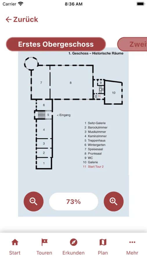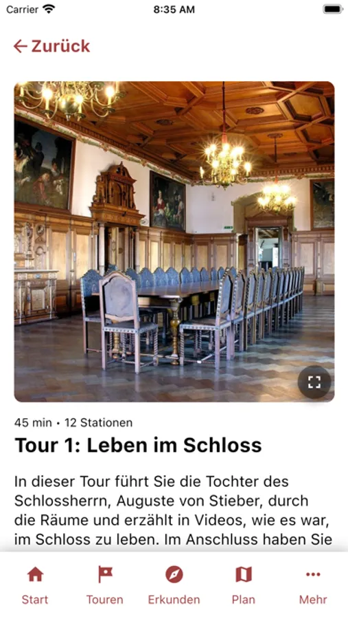 -geführte Tour durch die historischen Räume mit Videos zum Leben im Schloss sowie Texten und Audios zu den Räumen