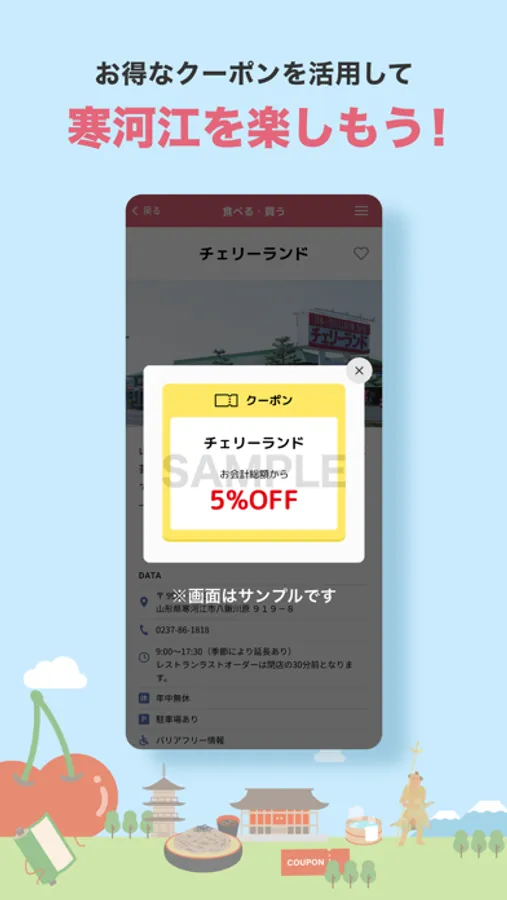 掲載スポットによってはおトクなクーポンもあるよ。ぐるぐるさがえを片手に寒河江市内を巡り、寒河江観光を楽しみ尽くそう!