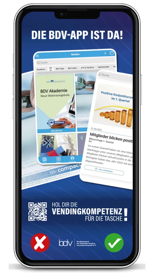 Die offizielle App des BDV Vending ermöglicht Verbandsmitgliedern den schnellen Zugang zu allen wichtigen Informationen. Lesen Sie die neuesten News, stöbern Sie in allen Verbandszeitschriften oder laden Sie sich einen der vielen Musterverträge herunter. In der Wissensdatenbank finden Sie viele wichtige Ressourcen für Ihre tägliche Arbeit. Über die Chat-Funktion tauschen Sie sich mit anderen Mitgliedern aus. Sehen Sie die kommenden Veranstaltungen und laden Sie Termine direkt in Ihren Kalender herunter.