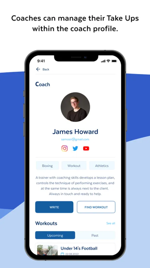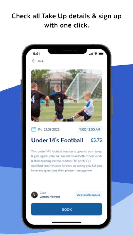 Users sign up & a simple click alongside any fee payment is all that is needed to sign up to try a new sport or attend ongoing Take ups as the coach adds them to the app.