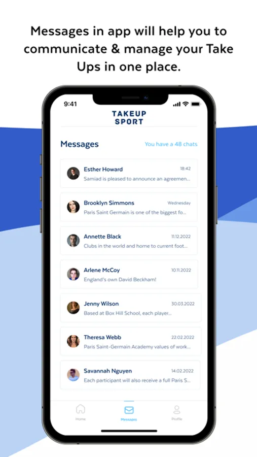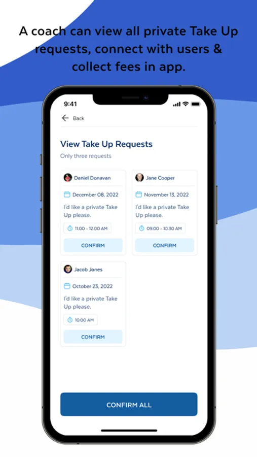 Private Take Ups can be requested by a user directly with the coach or facility & kept in app for simplicity. In app messaging is straight forward & helps build a better newcomer/coach relationship so retention for both the user & the coach is high.