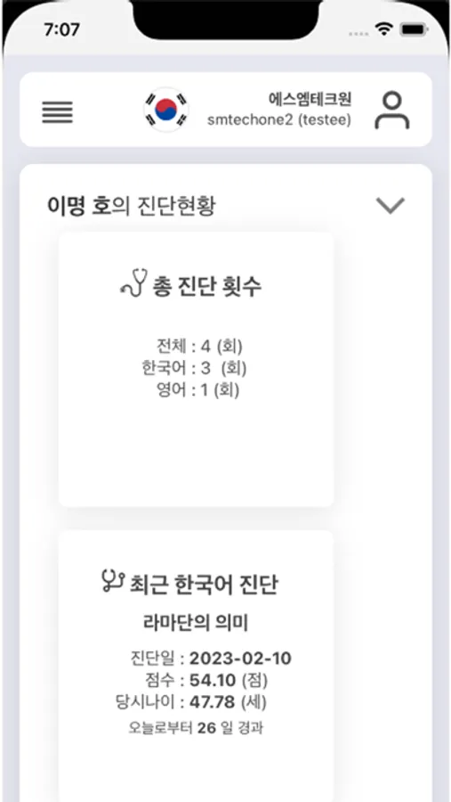 사용자의 시선읽기진단, 한국어 트레이팅, 안구운동검사에 대한 정보를 조회할수 있습니다.