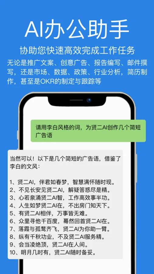 1、AI办公助手,协助您快速高效完成工作任务,无论是推广文案、创意广告、报告编写、邮件撰写,还是市场、数据、政策、行业分析,简历制作,甚至是OKR的制定与跟踪等。