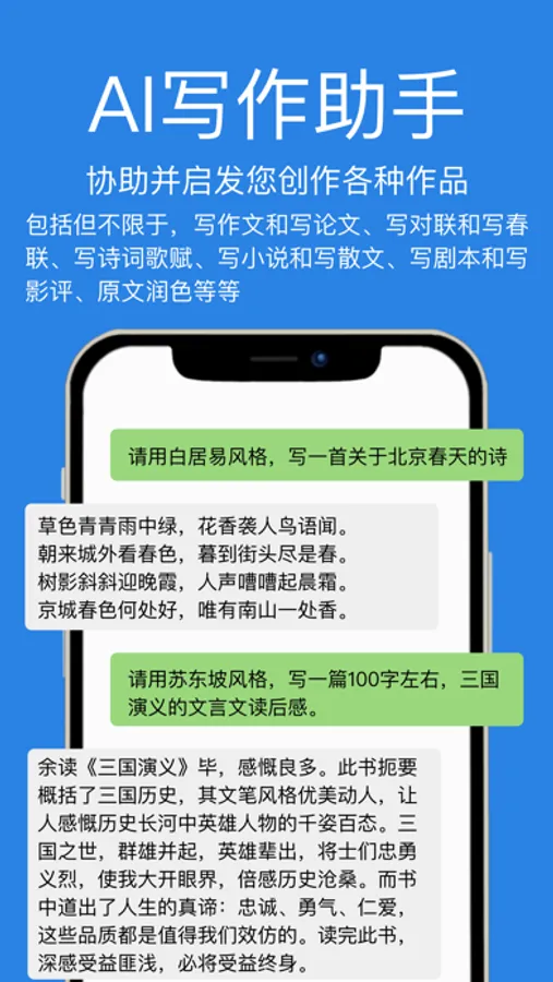 2、AI写作助手,协助并启发您创作各种作品,包括但不限于,写作文和写论文、写对联和写春联、写诗词歌赋、写小说和写散文、写剧本和写影评、原文润色等等。