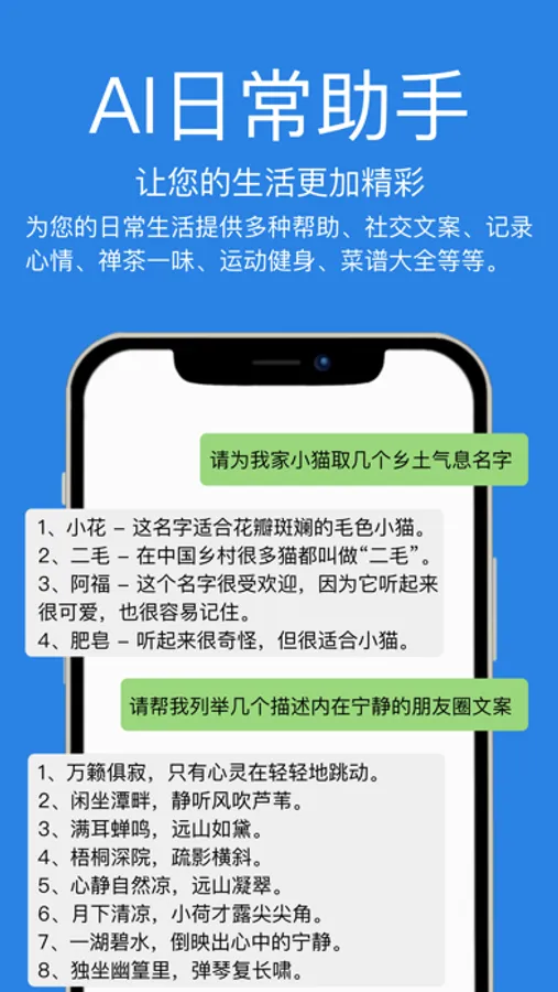 3、AI日常助手,让您的生活更加精彩,为您的日常生活提供多种帮助,智能起名、社交文案、记录心情、周公解梦、禅茶一味、运动健身、菜谱大全等等。