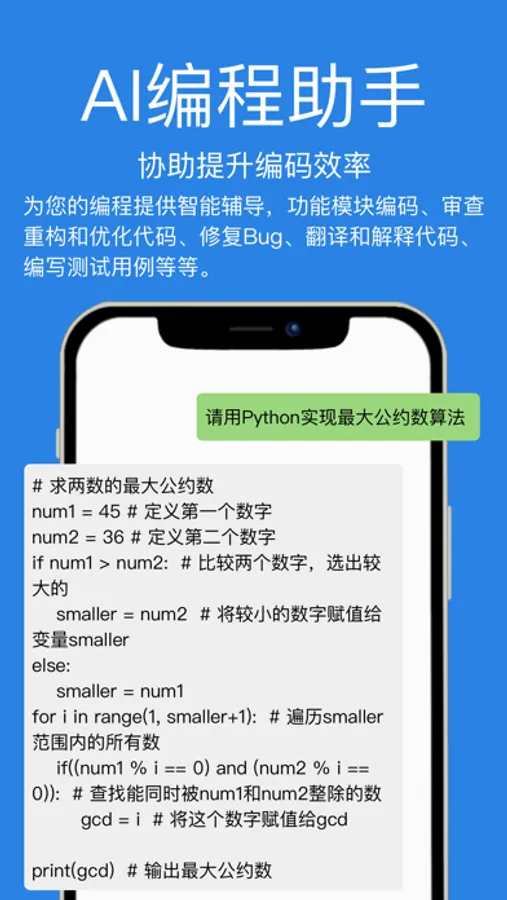 6、AI编程助手,协助提升编码效率,为您的编程提供智能辅导,功能模块编码、审查重构和优化代码、修复Bug、翻译和解释代码、编写测试用例等等。