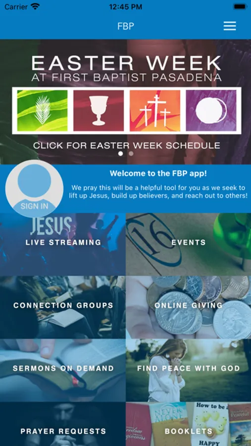 Welcome to the FBP App. Feel free to use this to access your church profile, gather info or register for upcoming events, give, take attendance in your group, and view sermons and worship.