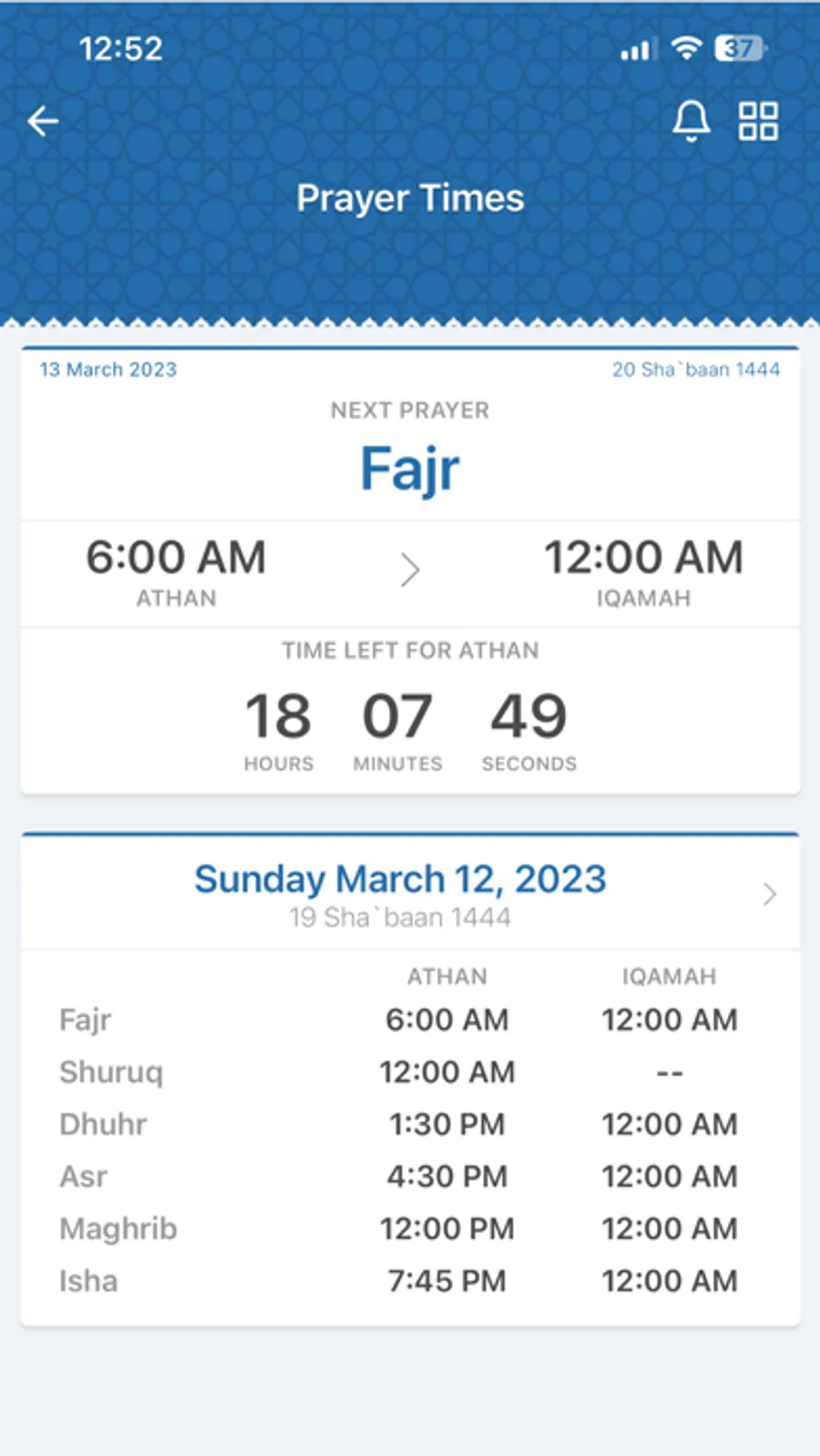 - Iqamah times