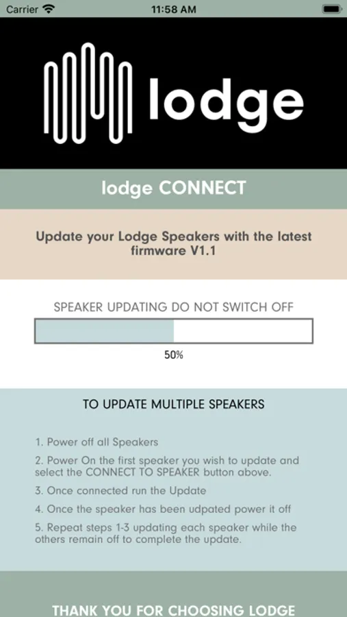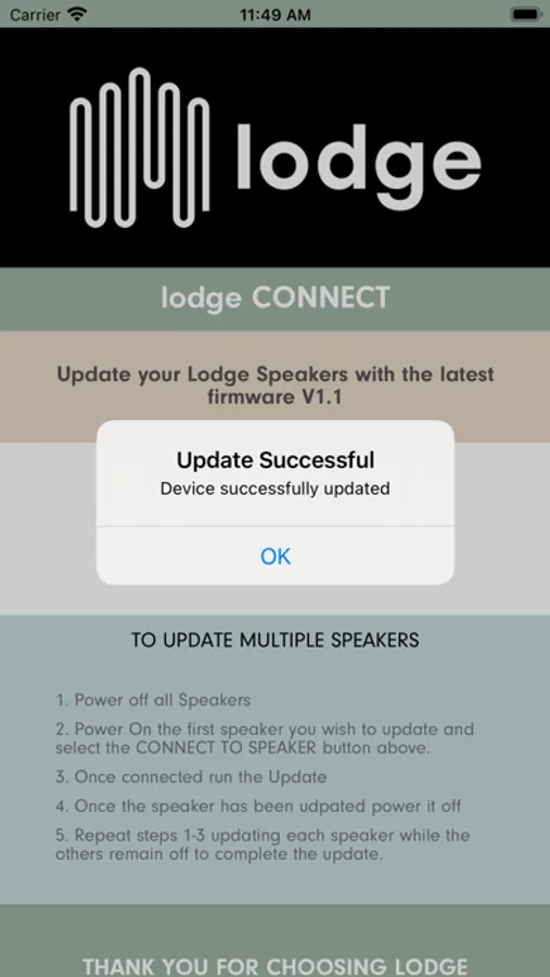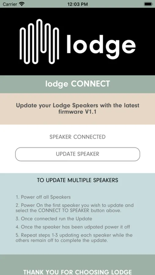 The lodge sound app is currently designed to enable OTA (over the air) firmware updates only. These updates will ensure that your speaker performance is optimal.