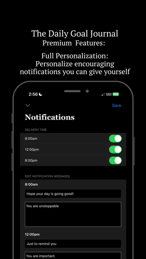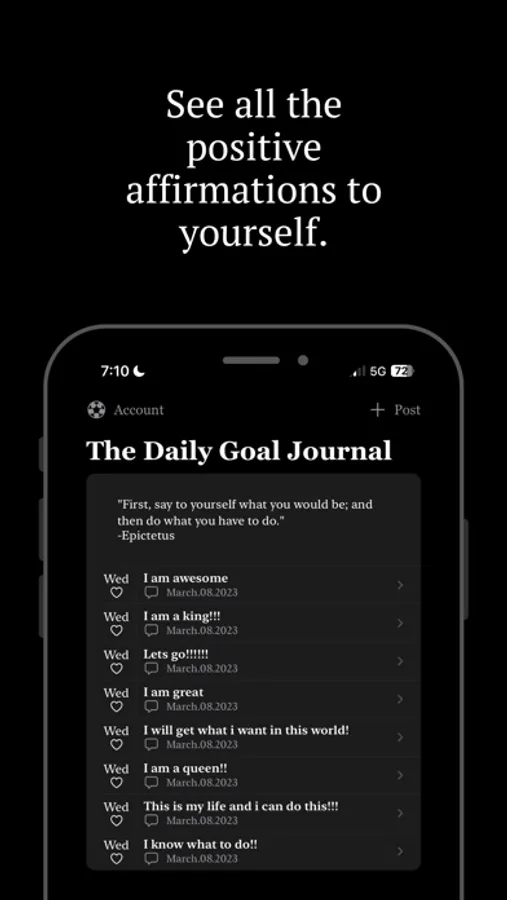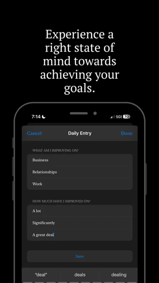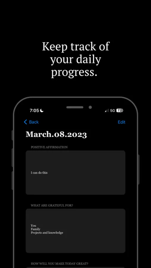 Each morning, you'll be prompted to write about what you're grateful for and how you plan to make the day great. These daily exercises will help you start your day on a positive note, and keep you focused on your daily goals. The app includes three daily prompts to help you identify areas where you can improve and affirm to yourself that you are making progress. By reflecting on your strengths and weaknesses, you'll be able to make positive changes in your life and achieve your goals with confidence. You can also look back on all the positive affirmations to yourself, knowing you are making progress!
