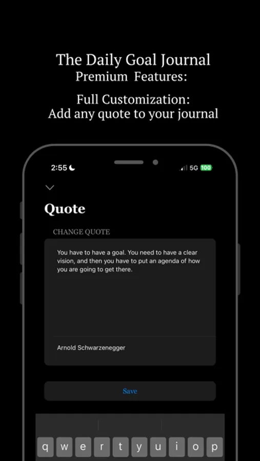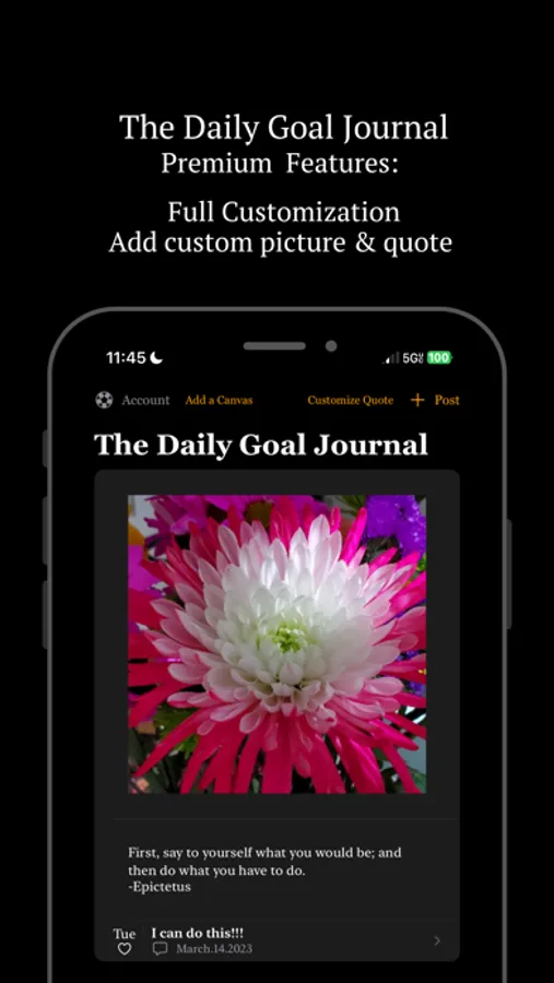 • The Daily Goal Journal is free to use for up to 14 posts, and offers two flexible subscriptions $4.99/month or $29.99/year auto-renewing subscription for The Daily Goal Journal Premium, which includes a 2-week trial, which is free to cancel at anytime. Included in the 2-week free trial and in any general subscription, one is able to have access to the premium features to The Daily Goal Journal such as custom notifications, to send positive and good messages to themselves, adding a picture to one's journal, or adding any quote the user wants to display for their journal, while also adding on more than 14 days within their journal, allowing the user to keep all of their positive affirmations with their account.