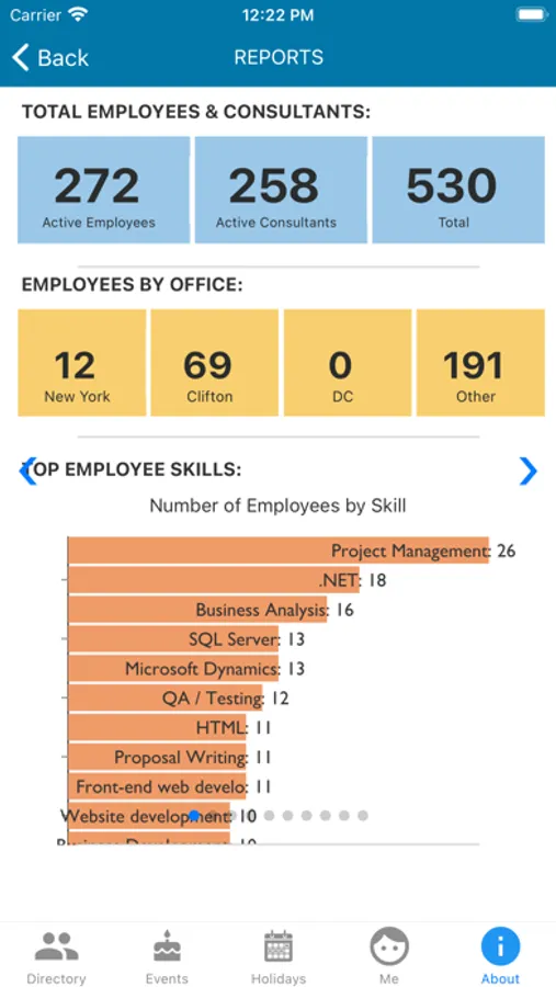 A rich, easy-to-use, employee skills directory for your company - an "internal linkedin" designed to be maintained by your HR team using a simple web portal. The entire company at your fingertips, always up-to-date. Search, lookup, call, text, email, check-in from home, or analyze timesheet utilization reports in seconds.