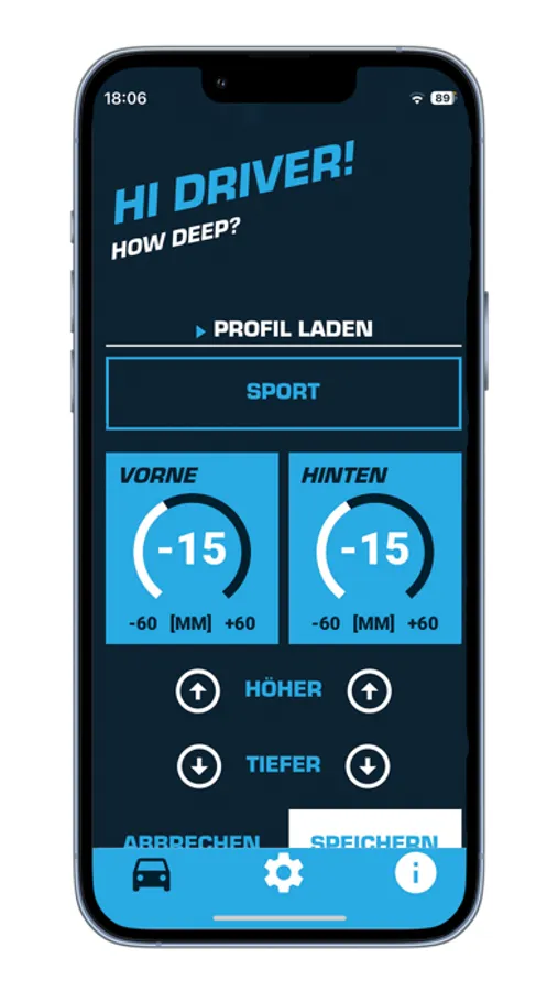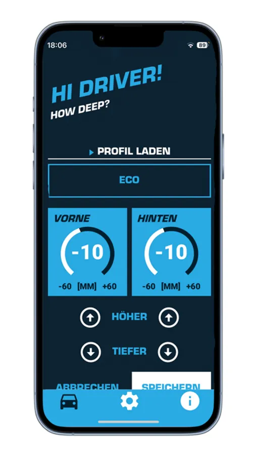 Lege Dein Auto per Knopfdruck tiefer oder höher. Aktiviere den Showmode für eine maximale Tieferlegung.