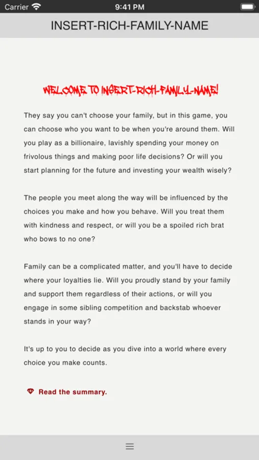 Insert-Rich-Family-Name, is an interactive mystery novel that lets you live the life of a billionaire and decide your own fate. With captivating storylines, unique characters, and multiple paths to take, this choose your own adventure game will have you hooked from the first chapter.