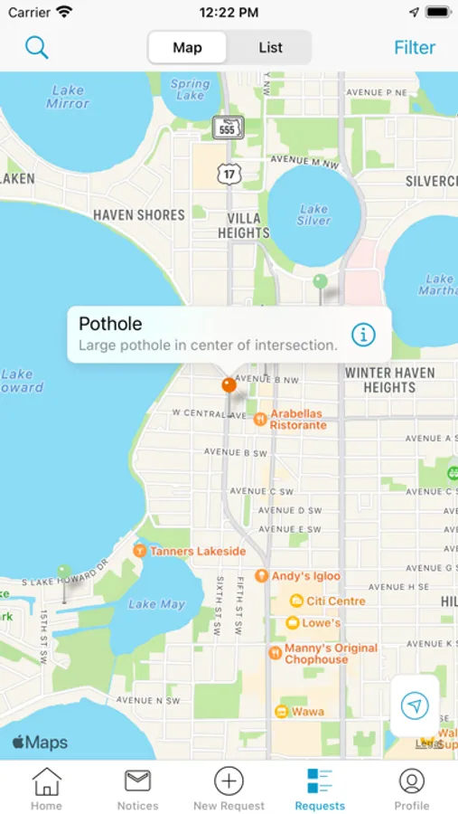 For those potholes, damaged street signs, and other local problems that need attention, the Access Winter Haven app makes reporting a problem easier than ever. This app uses GPS to recognize your location and gives you a menu of common quality-of-life conditions to select from. The app allows you to upload pictures or videos to accompany your request. The mobile app can also be used for a variety of other requests such as street maintenance, street light requests, damaged trees, park equipment, and others. Residents can track the status of reports they or other members of the community have submitted. Residents can also call Winter Haven at 863-291-5600 for information on any City service and to report a problem in town or visit us at 451 Third Street NW, Winter Haven, FL for free notary service or general town information.