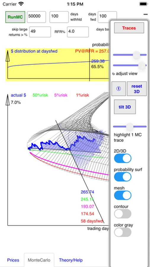 Aggregates monte carlo paths into a (price, time, probability) surface. Allows user to slice thru and examine this surface (e.g. price over time versus probability) and visualize the surface in 3D and with shaded contour plots.
