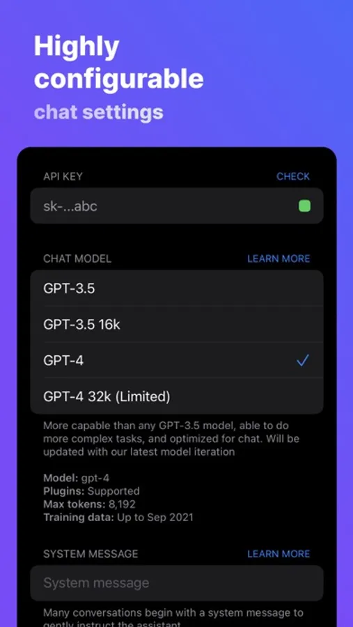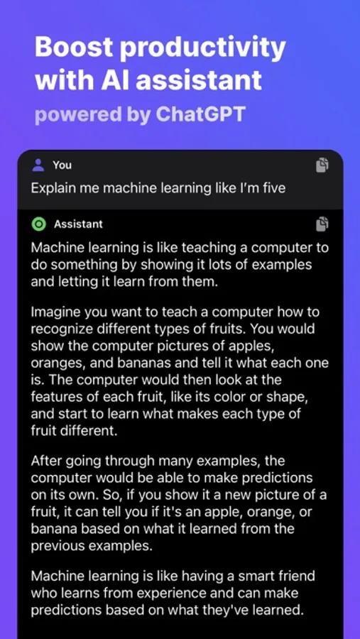 Amplify your productivity with system Shortcuts app integration: create a shortcut and let AI assistant run it for you. Use AI plugins (as system shortcuts) to control your iOS device.