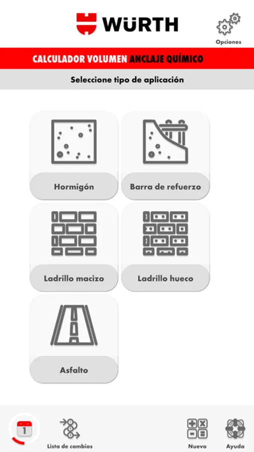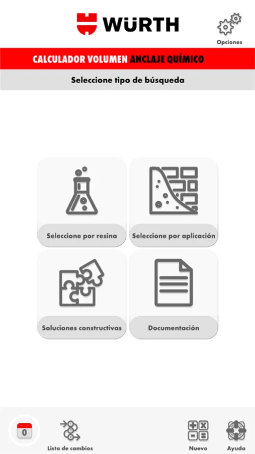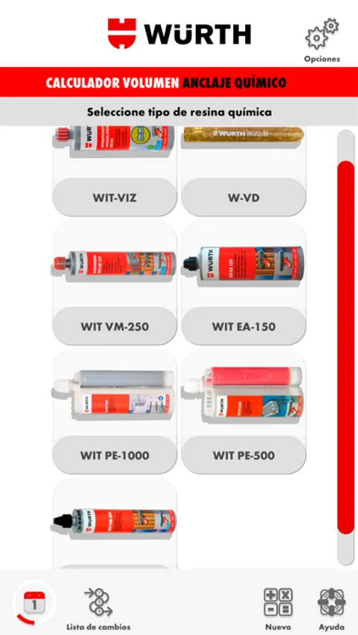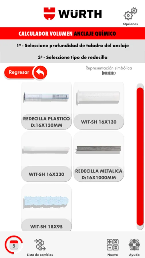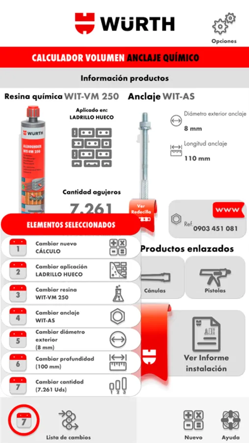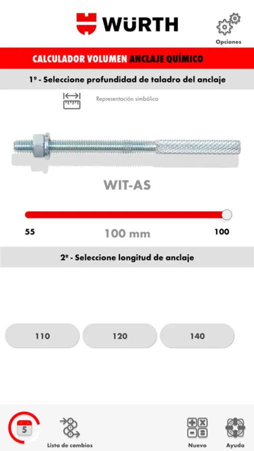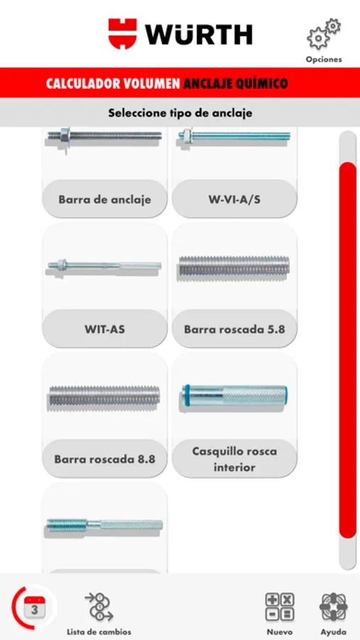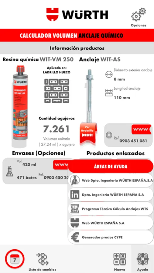 Calculador volumen anclaje químico WÜRTH, es una aplicación para la ayuda del cálculo y conteo de volumen de anclaje químico según el número de agujeros/anclajes a usar.