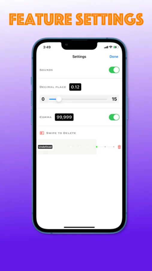 • Easily change settings on Comma , Decimal places , sound and swipe level for delete.