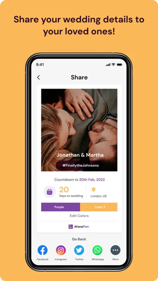Shareable Wedding Profile: Share your wedding details to your social platforms or text messages as a reminder or quick informational messages to your wedding guests!