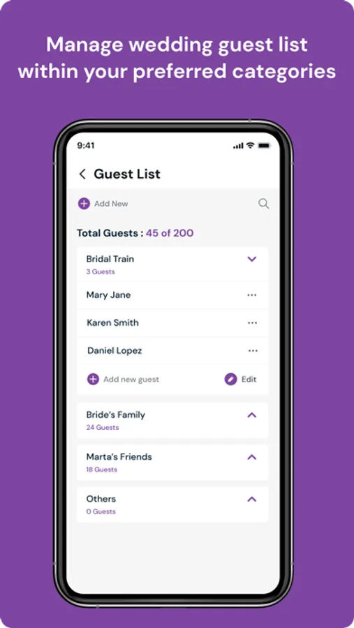Manage Wedding Guest List: Couples & planners are able to manage wedding guests list and create categories.