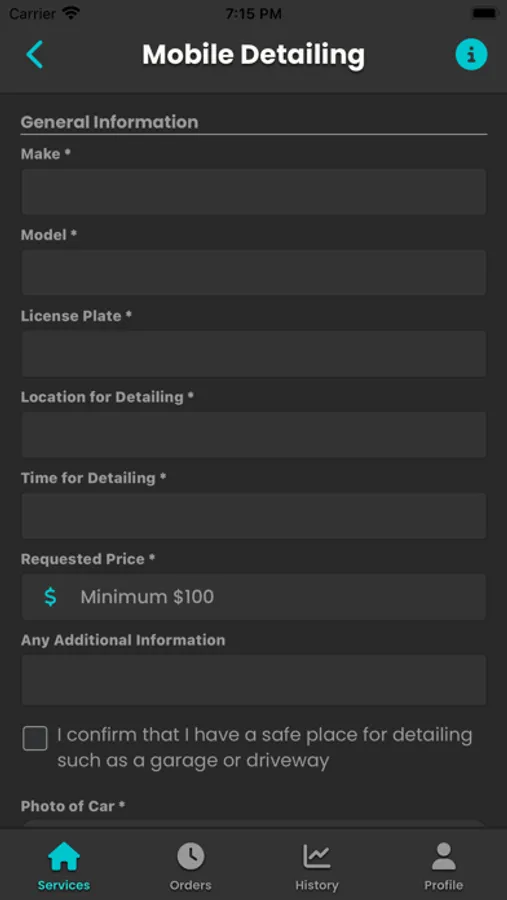 Just take some pictures of your car, upload them to our app, and set your desired price for the service. Choose a convenient date, time, and location for the detailing. Your request then gets posted to our network of skilled detailers.