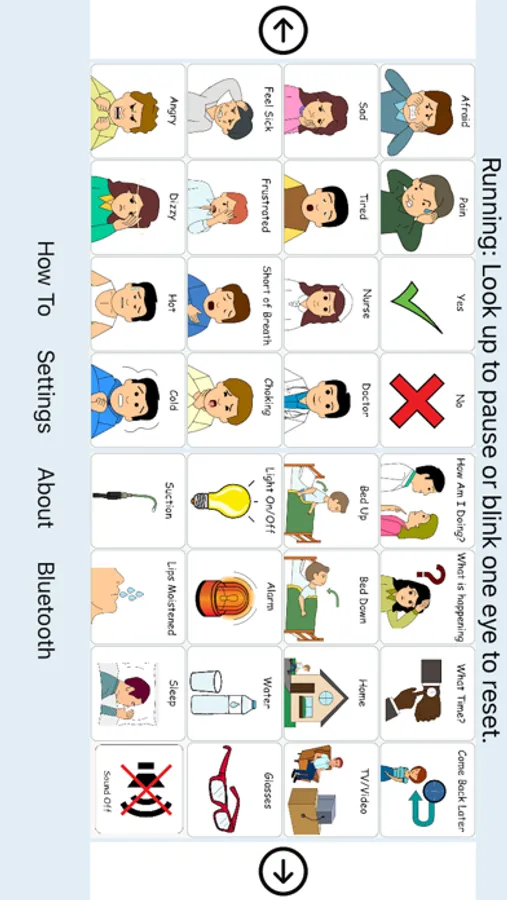 This app allows users with to select phrases and icons on a Communication Board with just their eyes. To select icons simply keep your head still and look all the way left, right, or up. In the settings menu users can adjust the sensitivity and time delays, select between different voice options, and even change the images.