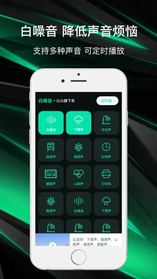 去除白噪音,让心静下来,包括下雨声、时钟声、心跳声,可复选试听,支持定时播放