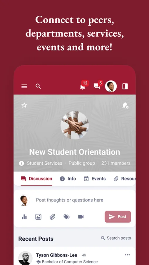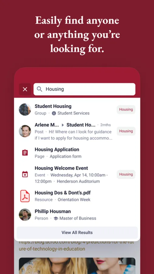 - Search staff, peers, systems, groups, posts, resources, and more.