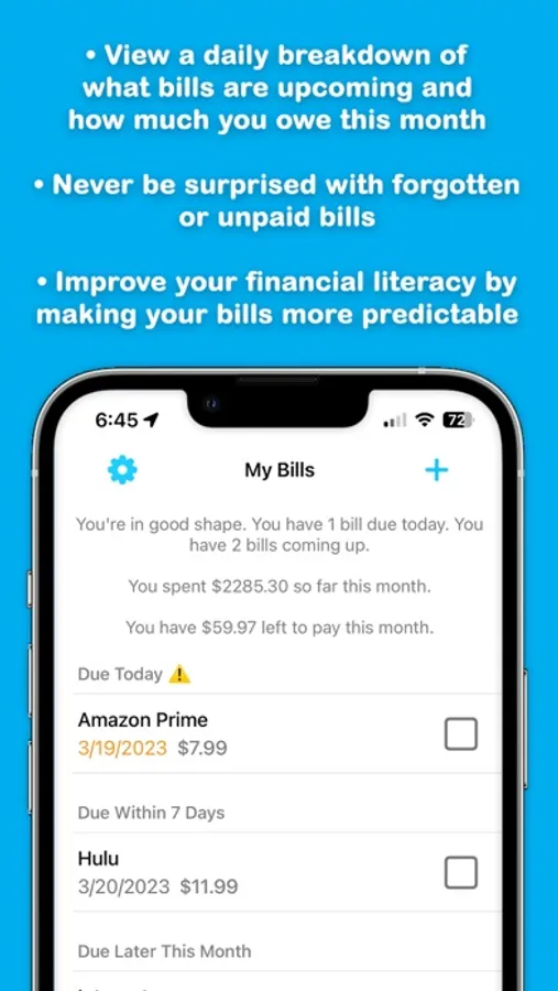 Improve your financial literacy by making your bills more predictable and receive notifications when bills are due so you never miss a payment again.