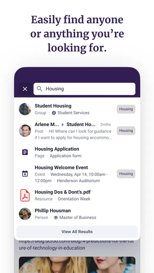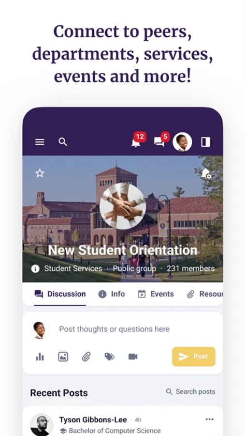 - Connect with staff, faculty, departments, and peers