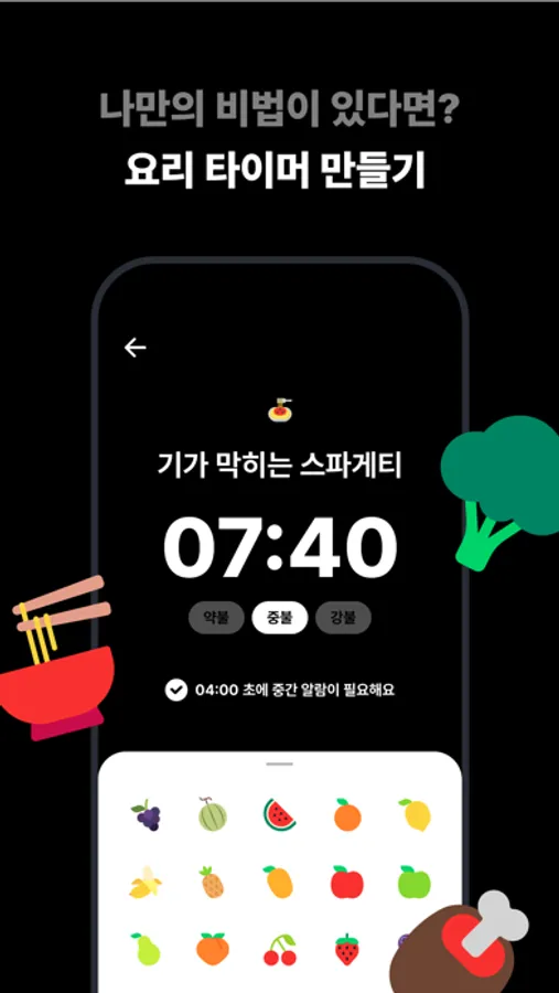 - 139개의 음식 아이콘으로 나만의 타이머를 꾸며보세요.