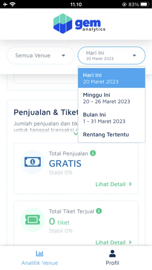 2. GEM Analytics App ini juga menyediakan fitur analitik “Penjualan Tiket”. Ketahui total tiket terjual, beserta persentase kenaikan atau penurunan penjualan dari waktu ke waktu.