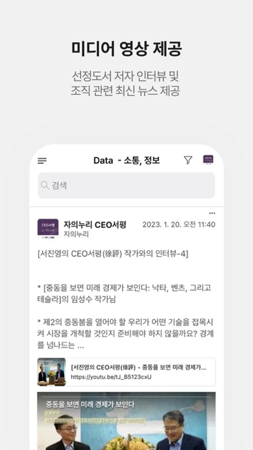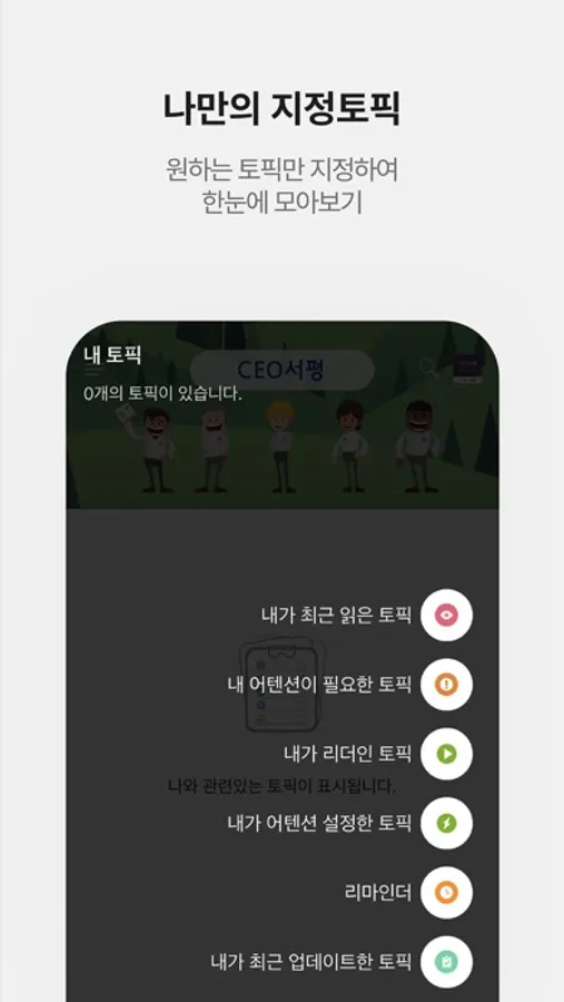 기업전용 플랫폼 서비스를 추구하고 있는 CEO서평 서비스는 경영, 인문, 클로벌트렌드 파악을 위한 명확한 독서 가이드를 제공합니다. 또한 기업의 목적과 주제에 맞는 도서콘텐츠를 신간도서 중심으로 완벽하게, 쉽고, 재미있게 확장된 서비스로 제공합니다. 이에 따른 CEO서평 서비스는 지식 체계와 품성을 가질 수 있게하는 지식네비게이션 서비스입니다.