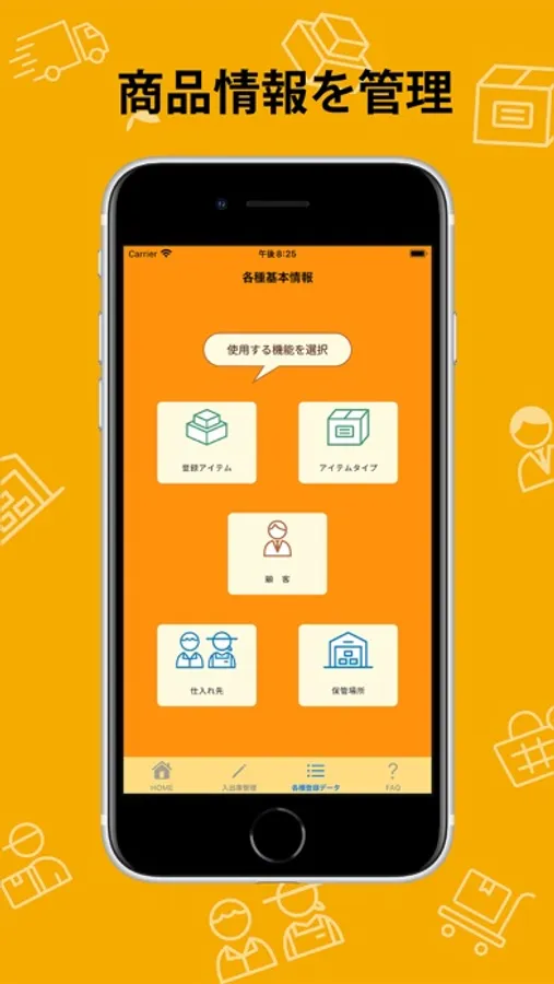 →データ検索:出庫情報は、出庫品名と商品に登録されたバーコード・QRコードで検索できます。バーコード・QRコードはiPhoneのカメラで読み込むか、番号を直接入力することで検索できます。