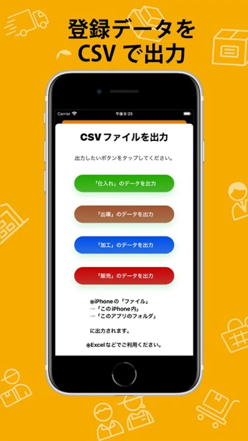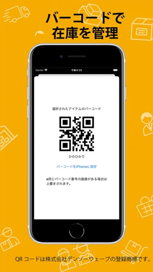 ※バーコードがついていない仕入れ品などはアプリ内で任意の文字列を元にQRコードを発行できます。QRコードはPNG画像として出力できます。