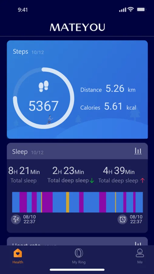 MATEYOU is the software that works with the smart ring. The data content obtained by the smart ring tracking will be displayed in the software in a timely manner. The software will detect and evaluate the user's exercise data and various health data based on the obtained content, and draw various intuitive charts to help users better and easily understand and adjust their daily life status.