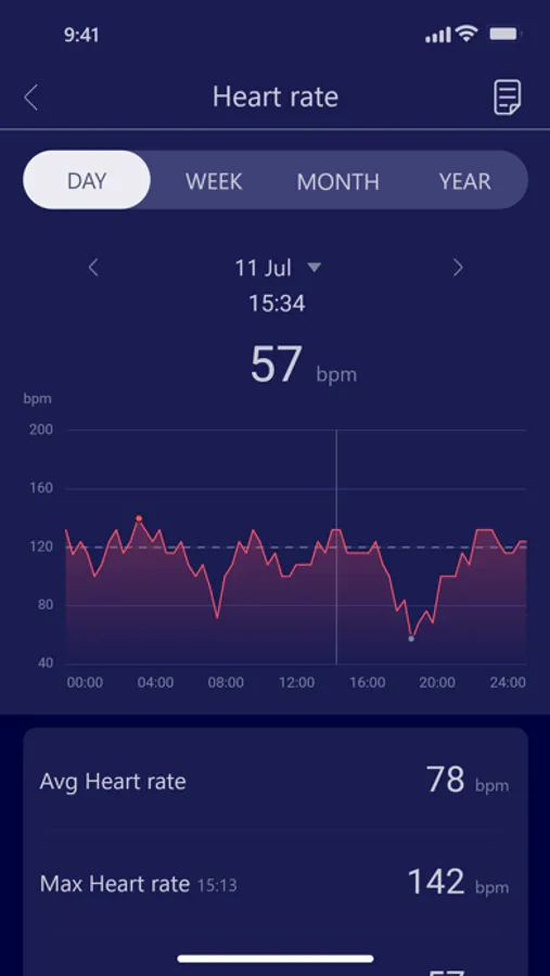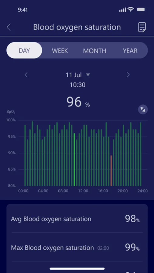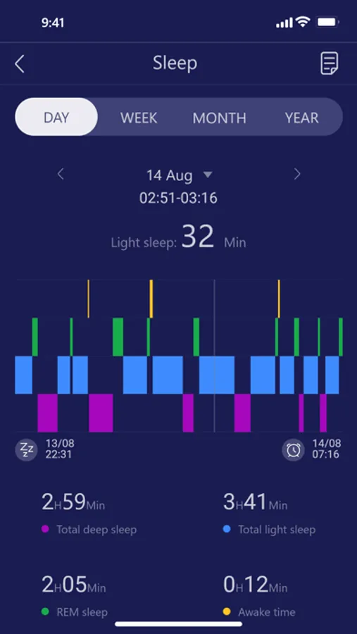 Records the user's sleep status, clearly shows the user's daily sleep and wake-up time, total sleep time, deep sleep time, light sleep time, REM time and wake-up time, and intuitively counts the percentage of deep sleep and light sleep to the total sleep time, to comprehensively and fully evaluate the user's sleep.