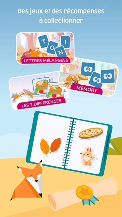 Durant le parcours, des moments de détente sont proposés via des activités de prolongement, des jeux et des récompenses de fin de session. L'enfant gagne des stickers souvenirs virtuels, à coller dans l'application à l'endroit dédié sur son carnet de voyage, mais aussi sur sa valise pendant les grandes vacances.