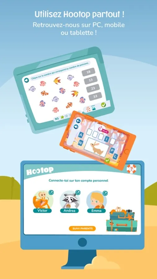 Un abonnement Hootop inclus jusqu'à 3 profils pour s'entrainer en mathématiques, français et anglais toute l'année, en s'amusant !