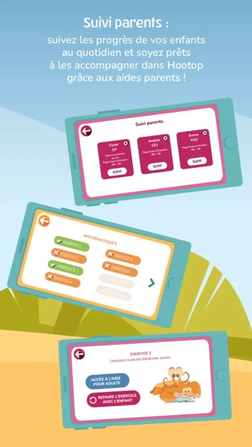 Hootop est à la fois un cahier de révisions et un cahier de vacances. Elle permet d'apporter un soutien permanent à l'enfant via des exercices adaptés à son niveau et au moment de l'année.