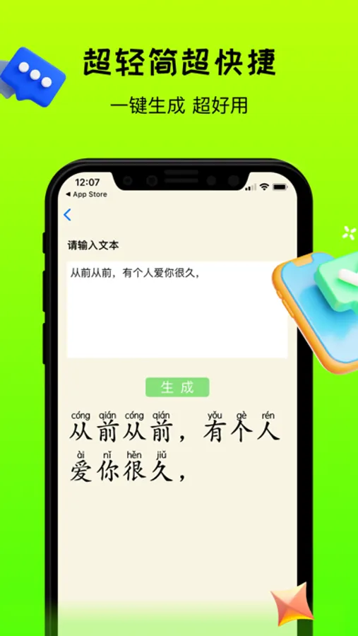 第一,文字转拼音。该功能可以将汉字转换成拼音,方便儿童学习汉语发音。在学习汉字的同时,儿童可以通过该功能学习正确的发音,提高汉语听说能力。