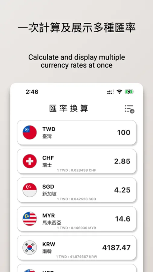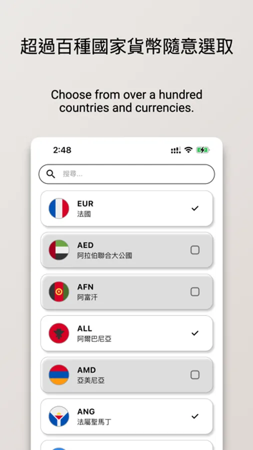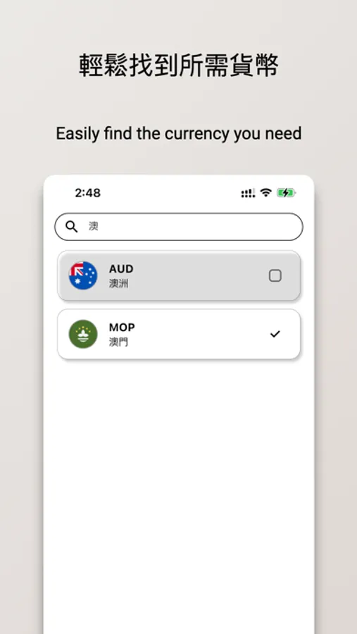 這是一款功能豐富的貨幣換算工具,用戶能夠自由增加或刪減想要的貨幣種類,並且支援中英文搜尋,讓你能快速找到所需的幣種。